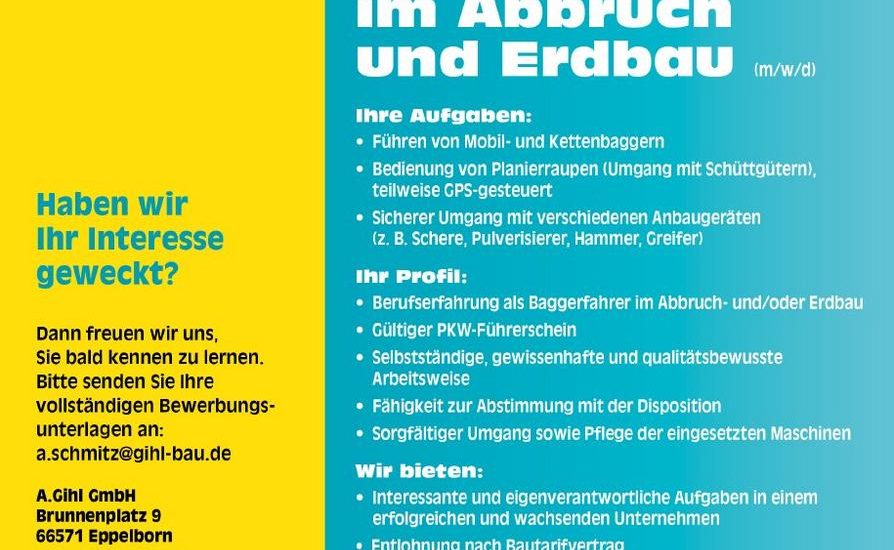 • Berufserfahrung als Baggerfahrer im Abbruch- und/oder Erdbau